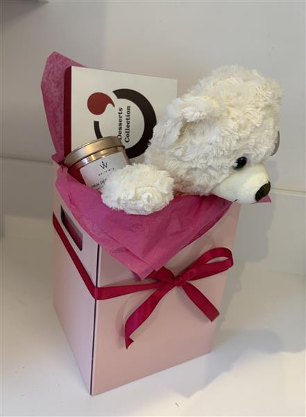 Soft teddy, beautiful scented candle and luxury chocs gift wrapped